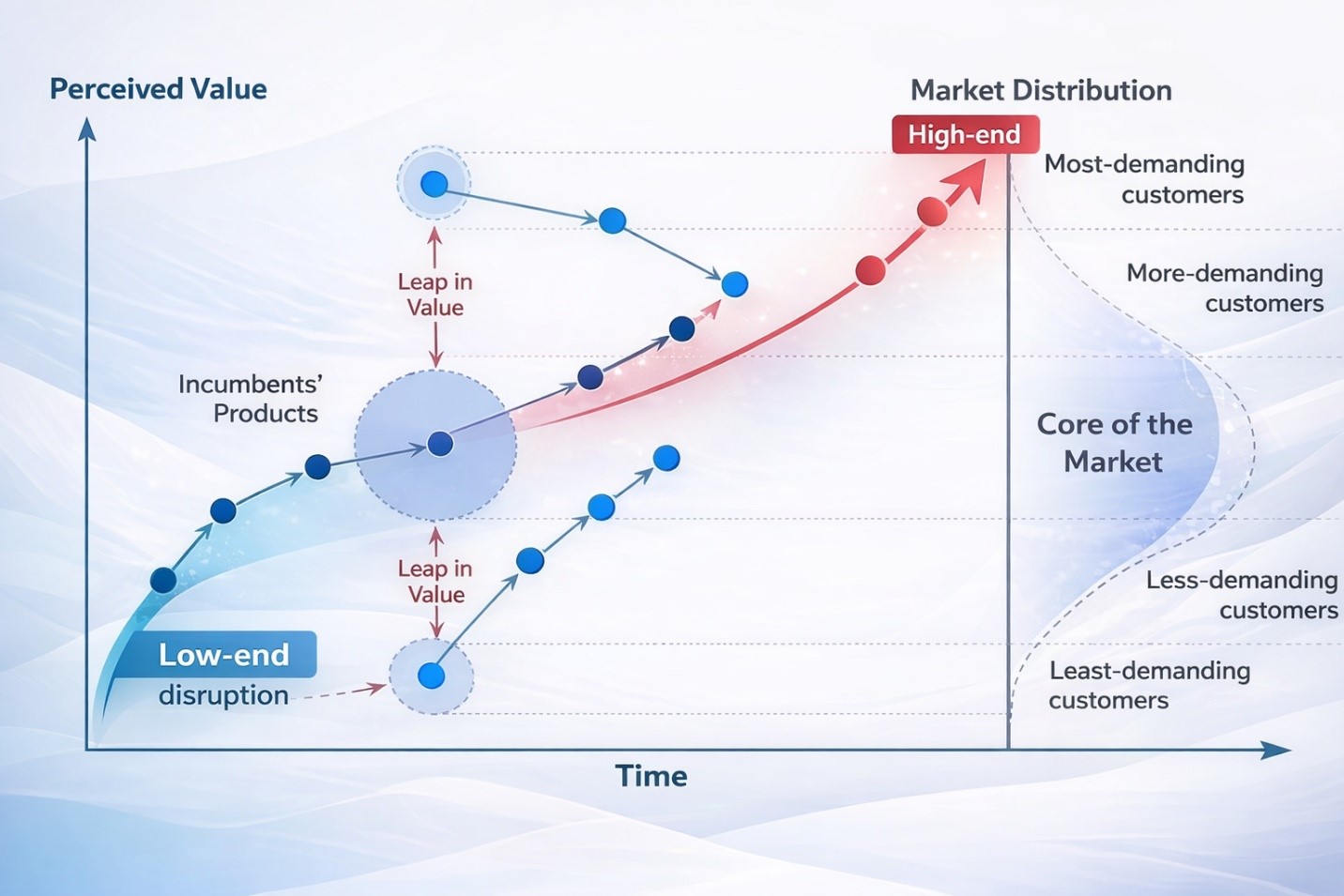 แต่กลับตอบโจทย์กลุ่มลูกค้าที่ไม่ได้ต้องการ “สุดยอดคุณภาพ” หากต้องการเพียง “ดีพอ” ในราคาที่เข้าถึงได้ เมื่อเวลาผ่านไป ผู้เล่นเหล่านี้พัฒนาคุณภาพขึ้น และสามารถกินตลาดขึ้นไปเรื่อย ๆ จนกระทั่งโค่นผู้นำเดิม